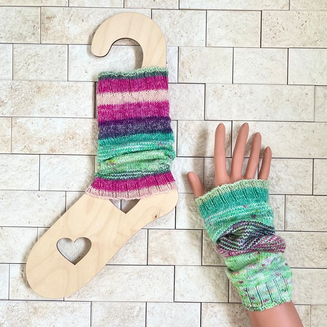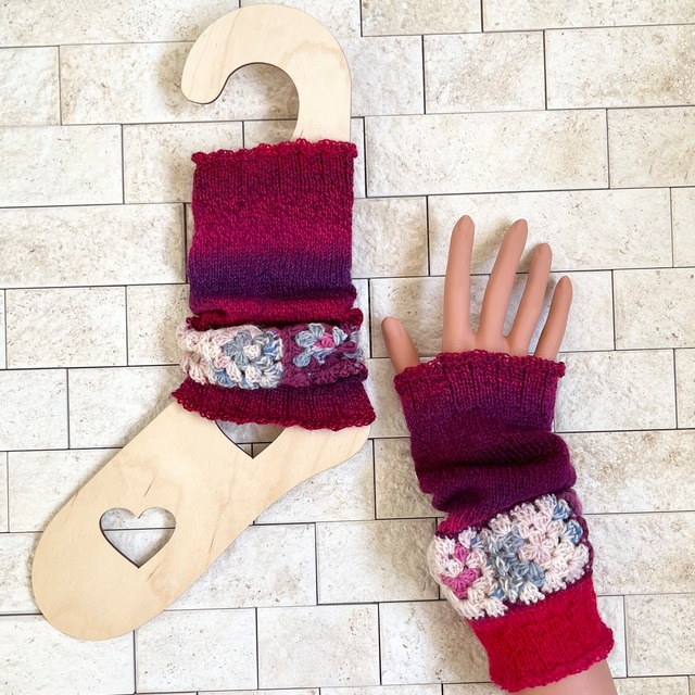 【新色】袖口から柄が…ハンドウォーマー[ピンクミックス]アームウォーマー 指なし手袋 温活 手編み