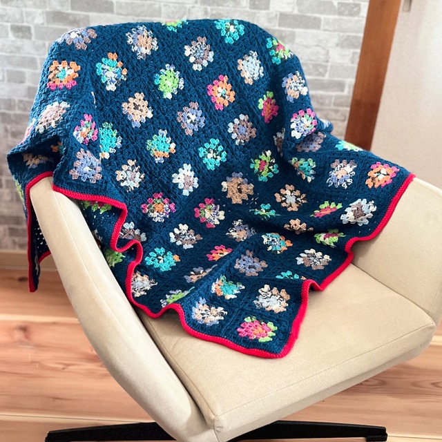 モチーフを117枚つなぎ合わせたブランケットです。 ウール75%×ナイロン25% 靴下用の糸で編んでいますので暖かく丈夫です。 カラフルな糸を使用していますがグレーの糸が上品にしてくれました。 肩からかけても、膝にかけても、ソファーにかけても色々な場面で使用いただけます。 サイズ: 縦 約115cm 横 約74cm 重さ 約433g 【洗濯について】 洗濯時は毛糸用の洗剤を使用。 ネットに入れて洗濯機で洗い平干しして下さい。 【作品について】 ※デザインから制作まで、すべて1人で行っております。丁寧に制作するように心がけておりますが、ハンドメイドということをお理解の上ご購入ください。一つ一つ手作りの為、微妙な形の違いが出ます事をご了承くださいませ。 ※商品の色は、なるべく実際の色に近くなるように撮影しておりますが、モニター環境などにより、実物の色と多少異なる場合がございます。 ※ハンドメイドに限らずどんな物でも乱暴に扱うと破損の可能性も高くなりますので、どうぞ大切に扱って頂ければ幸いです。