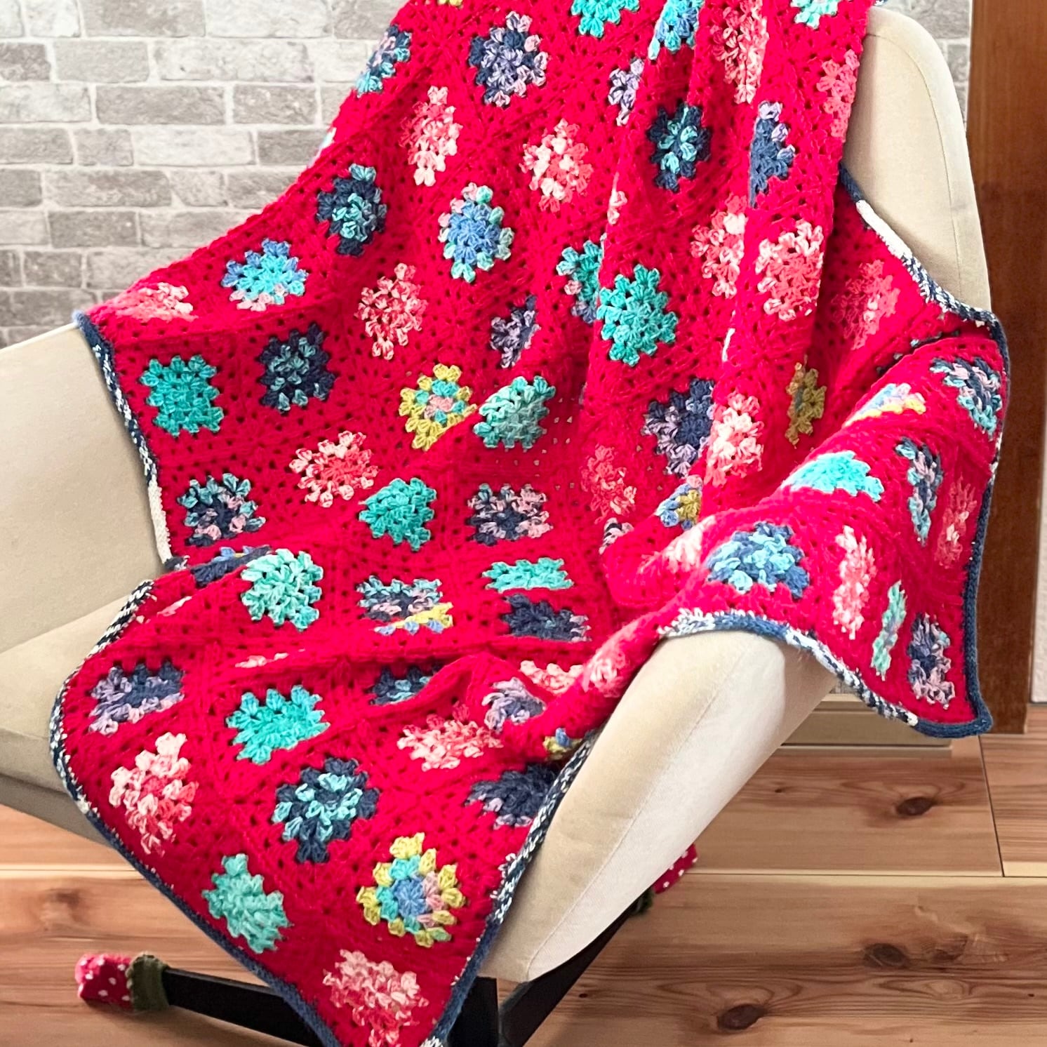 モチーフを117枚つなぎ合わせたブランケットです。