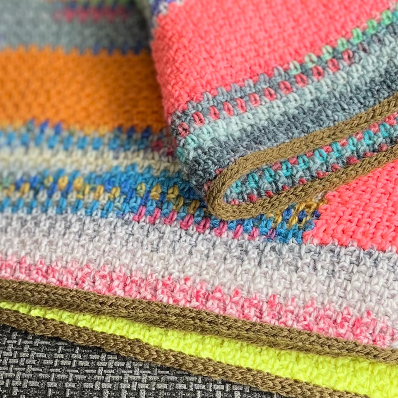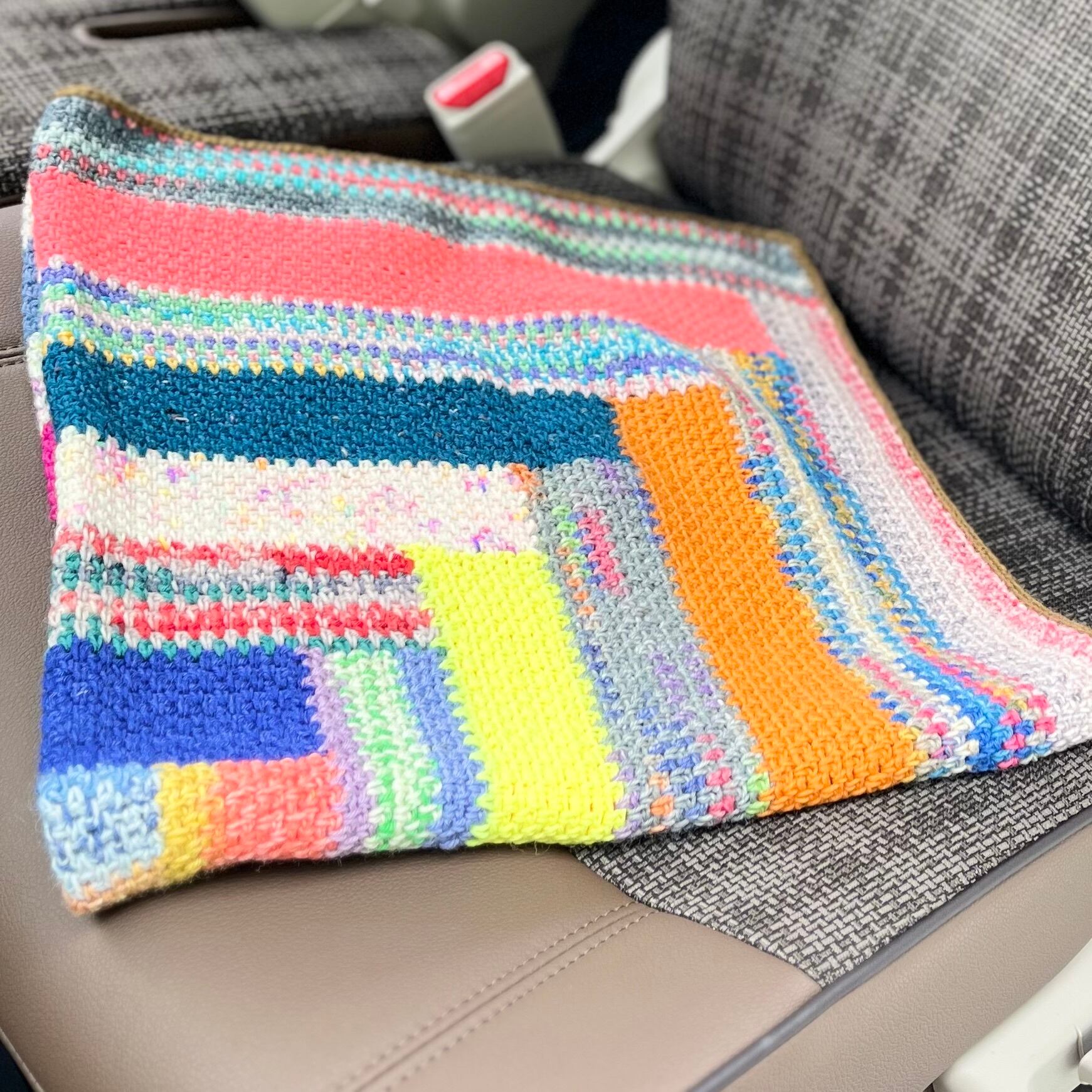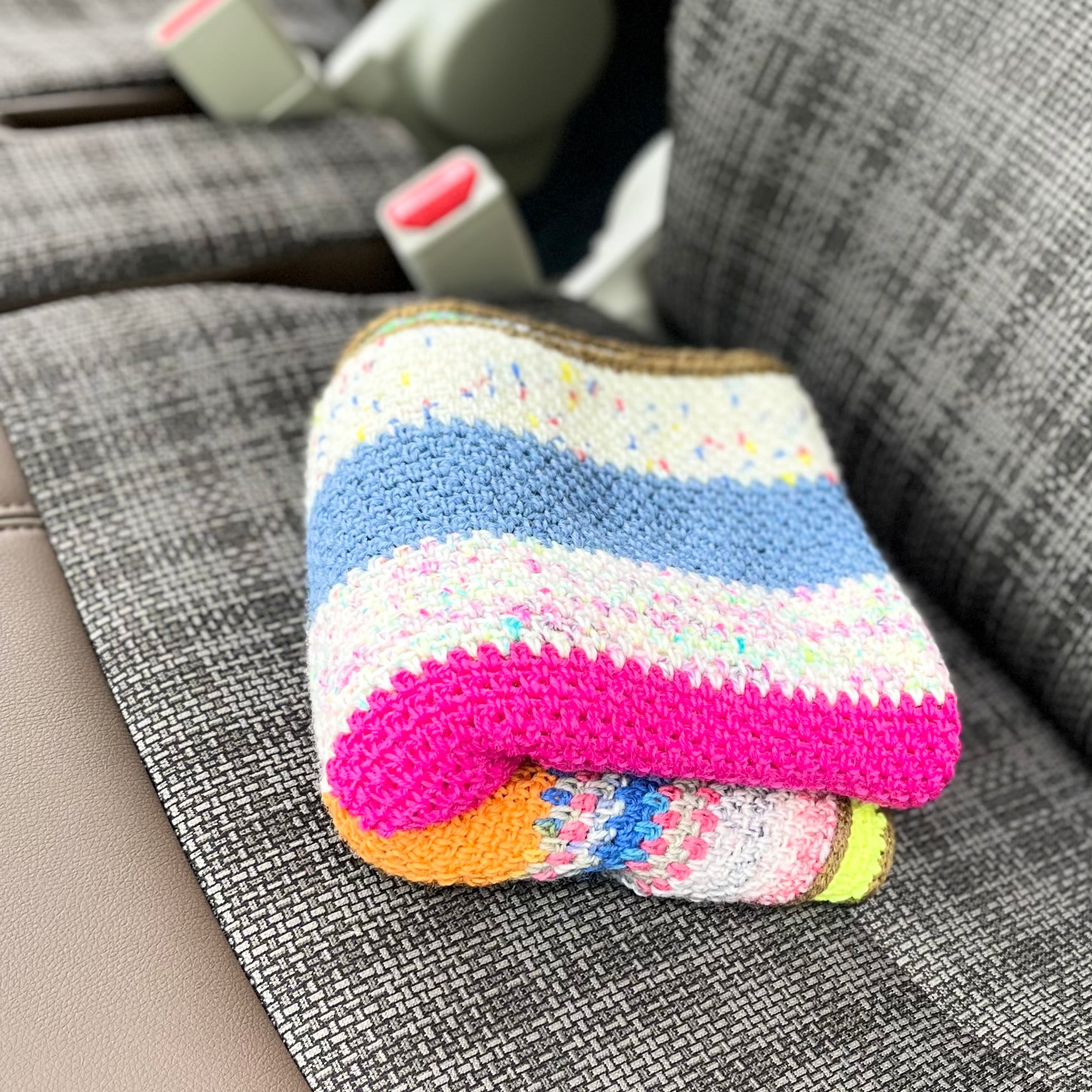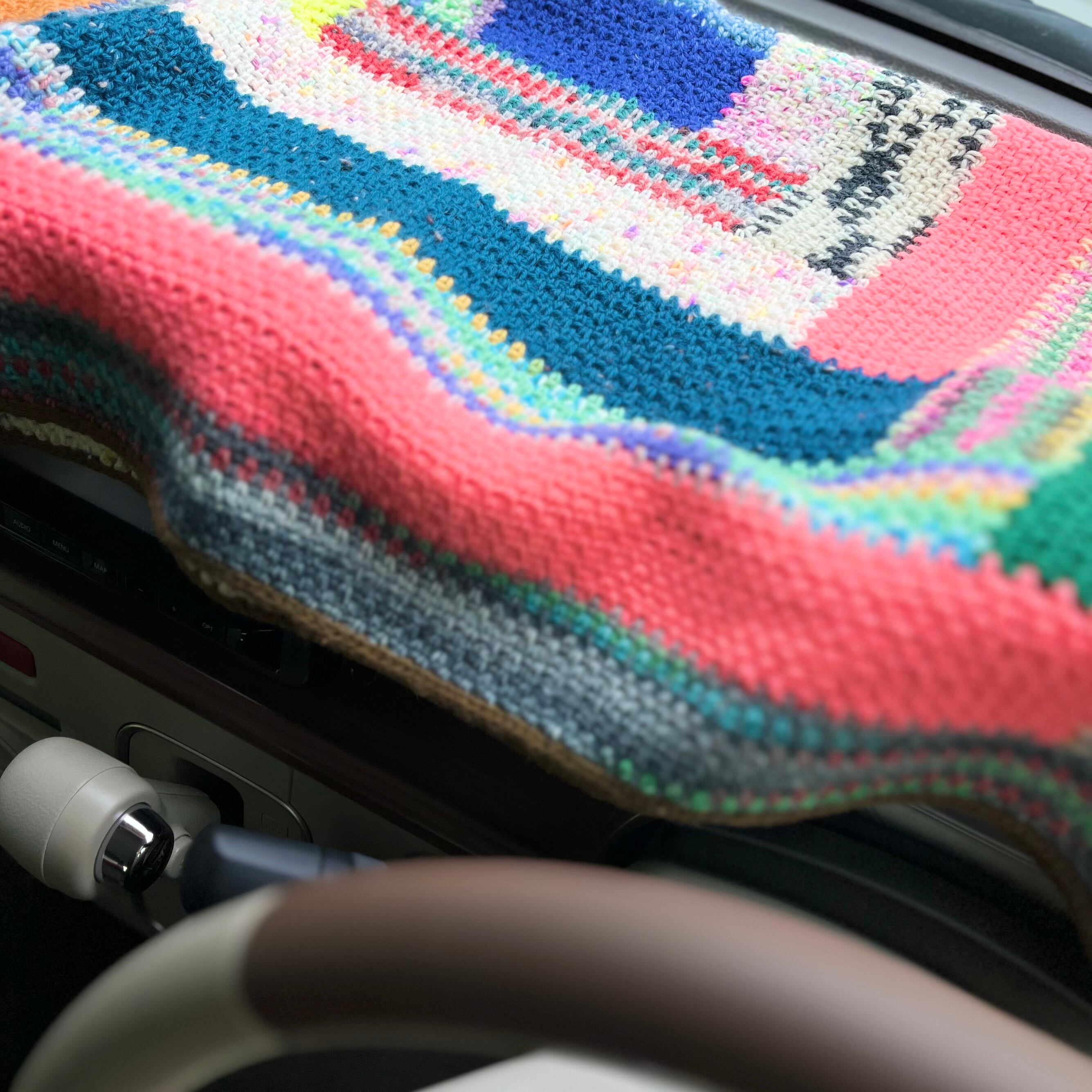 車の中で膝にかけても邪魔にならないサイズで編みました。